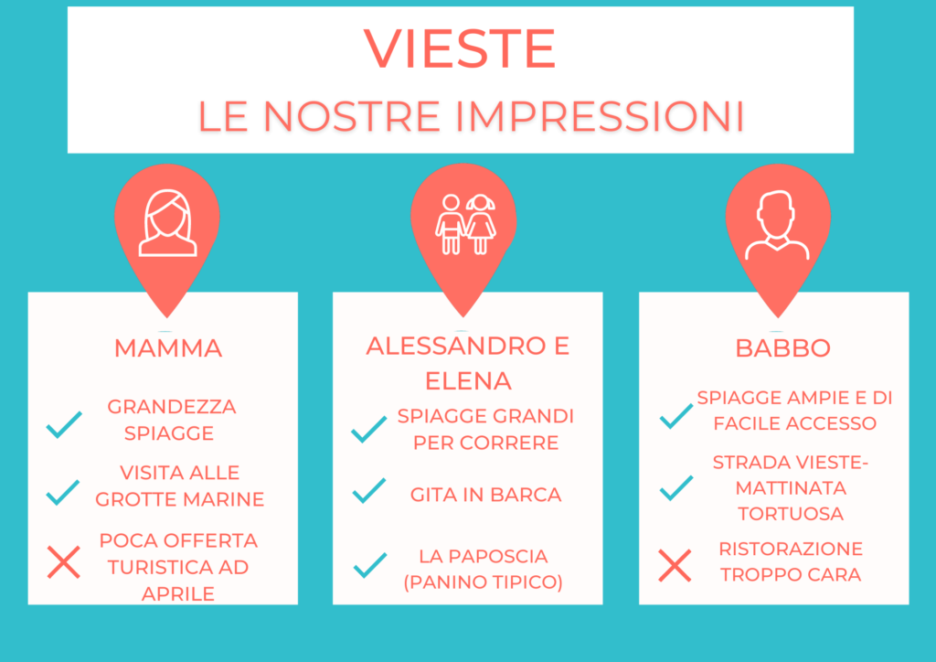 Dal mio punto di vista ho apprezzato molto l’ampiezza delle spiagge e, seppur disponibili solo d’estate, le molte aree gioco sull’arenile per i bambini. Imperdibile le grotte, un’esperienza da fare assolutamente a Vieste. Mi è dispiaciuto vedere la città ancora poco pronta ad accogliere i turisti in primavera. Eppure Vieste è un ottimo punto di partenza per visitare altri centri come Peschici o la Foresta Umbra.